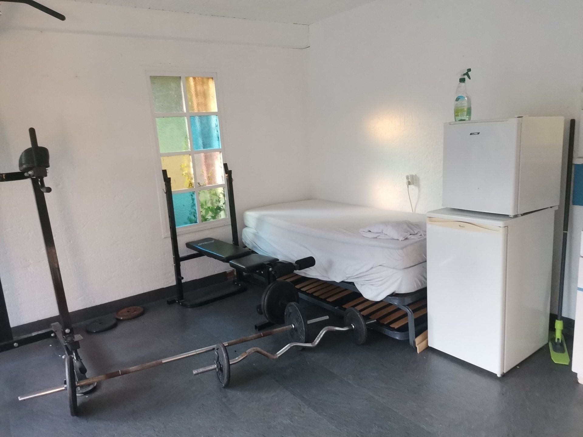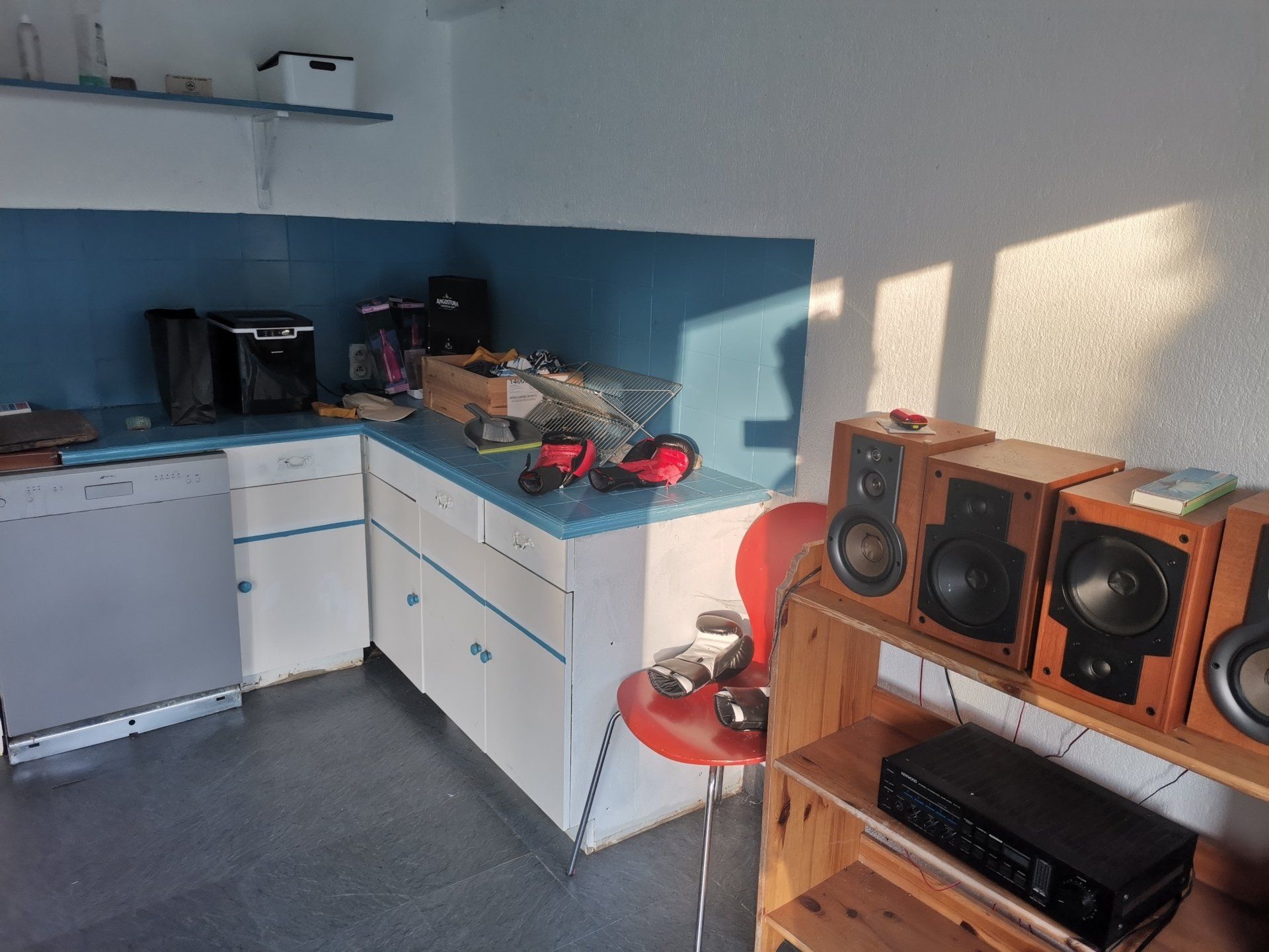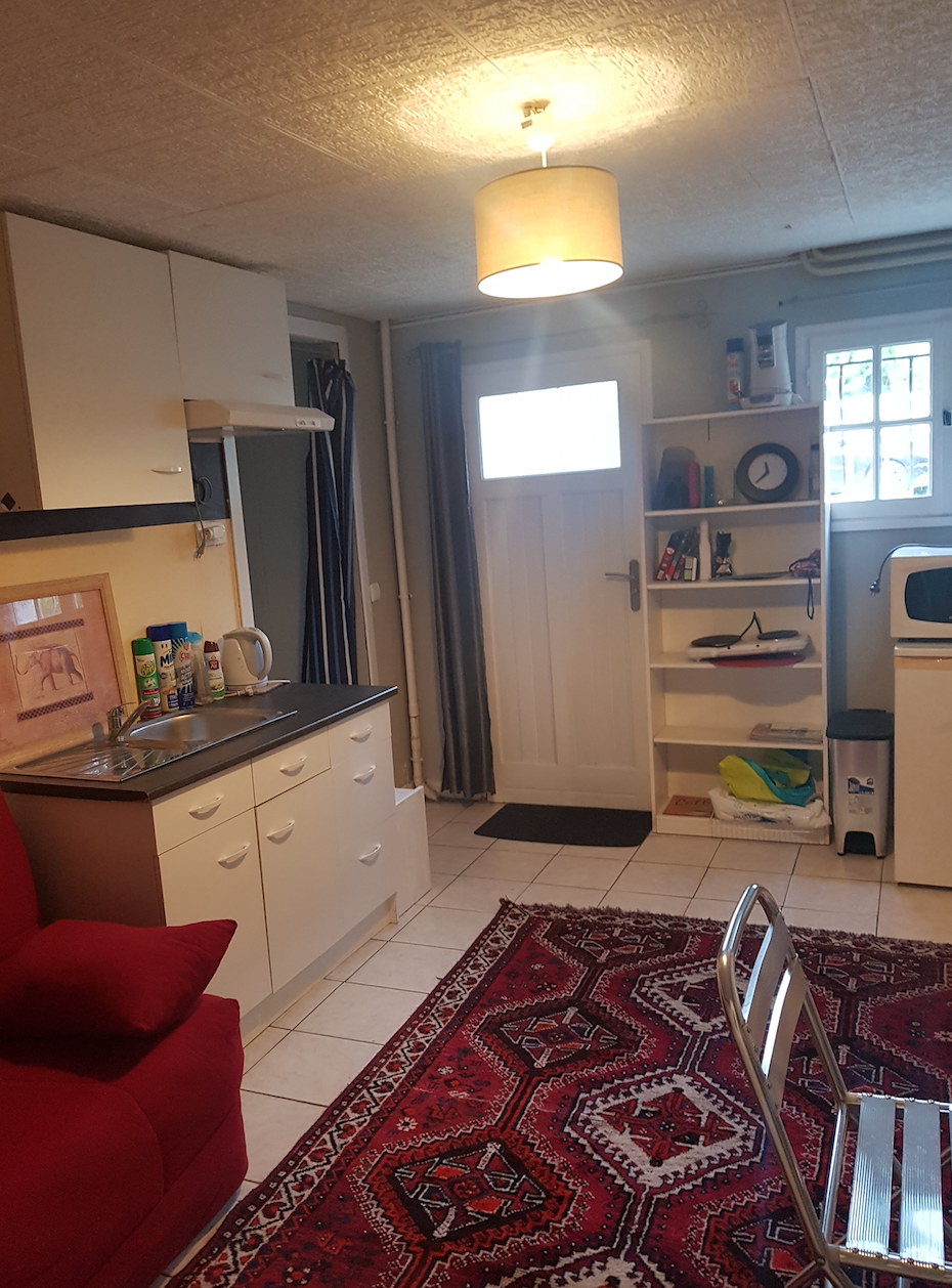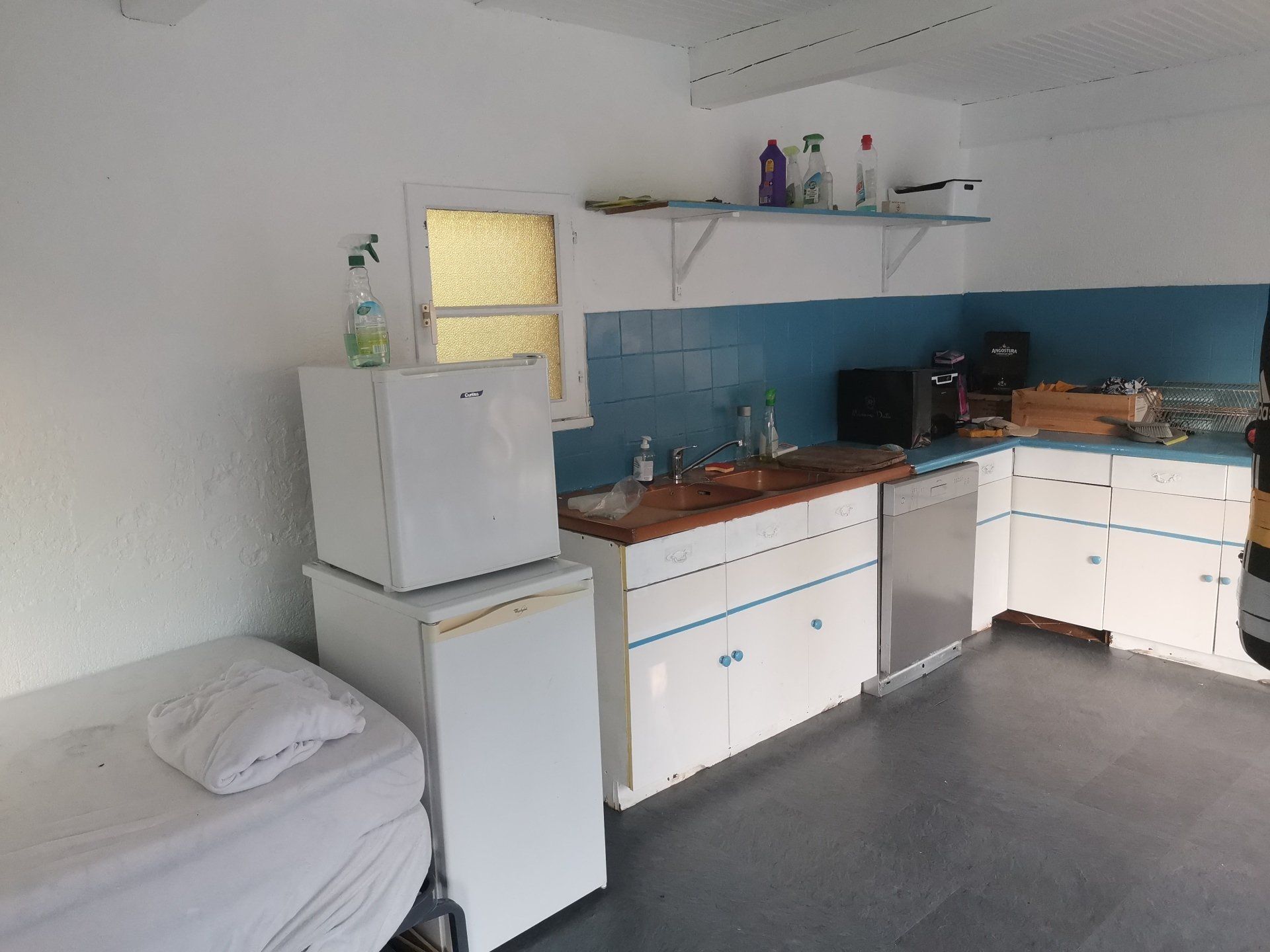 Cuisine d'été avec refrigérateur, congélateur et machine à glaçons.